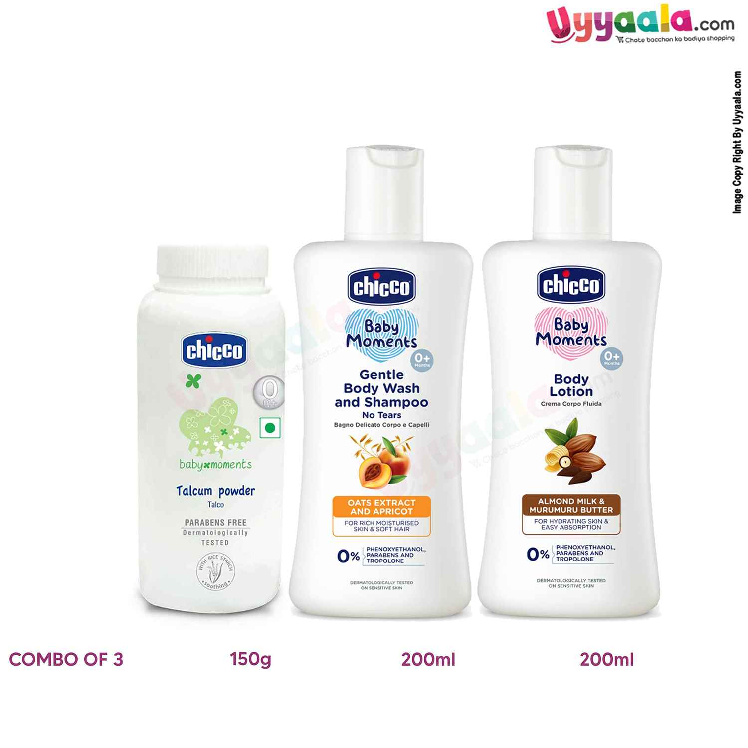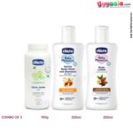 CHICCO Baby moments combo pack(Talcum powder – 150g, Body wash & shampoo – 200ml, Body lotion – 200ml)