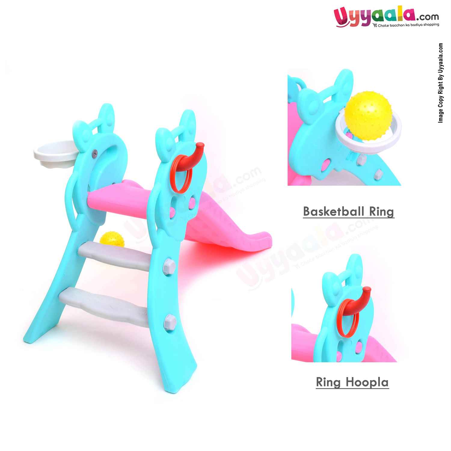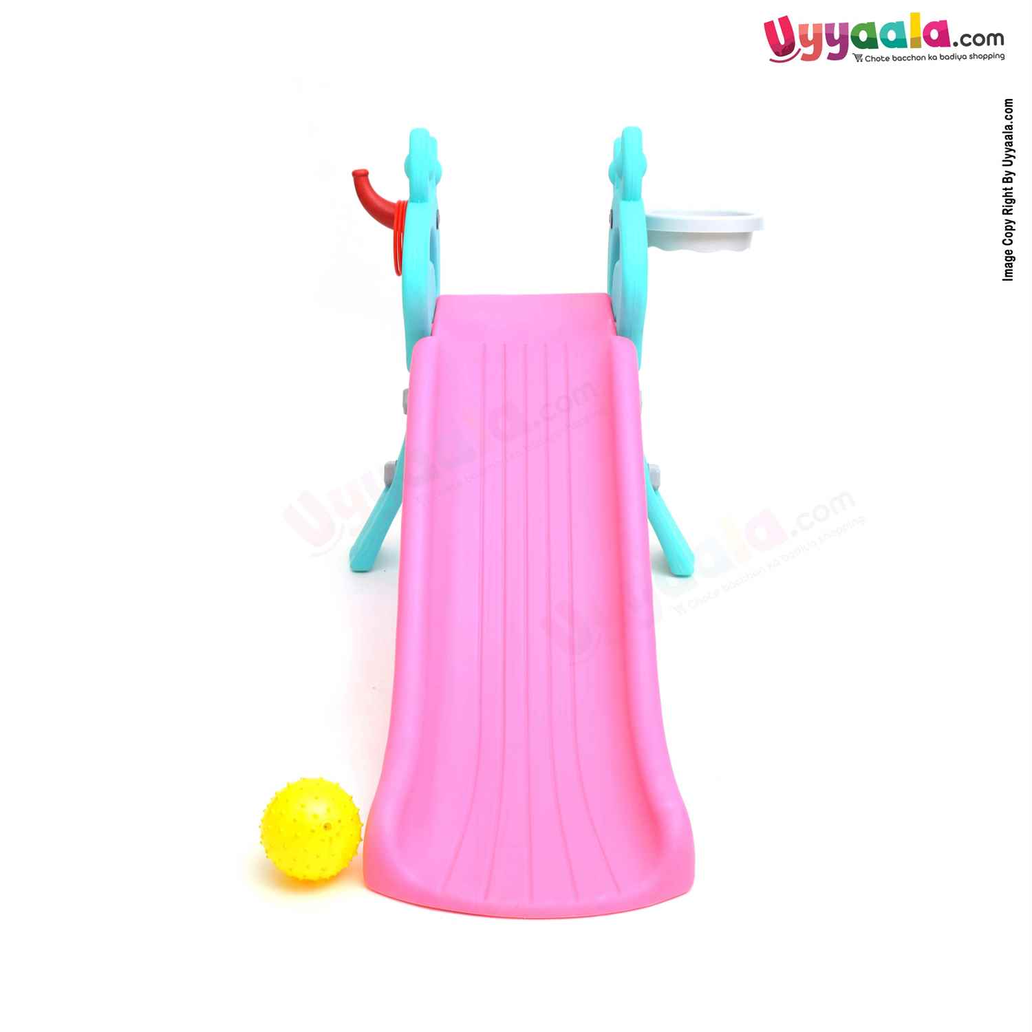 Indoor Slide for Kids with 3 Rings & 1 Basket Ball with Hoop 1 + Age 170*80*100cms – Pink-Blue