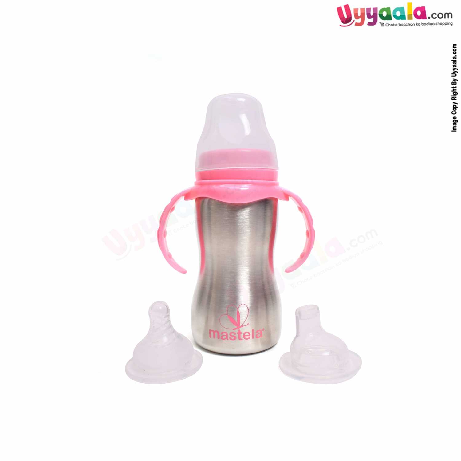 MASTELA Stainless Steel Twin Handle Feeding Baby Bottle Cum Sipper with Two Nipples 290ml – Silver