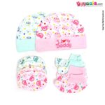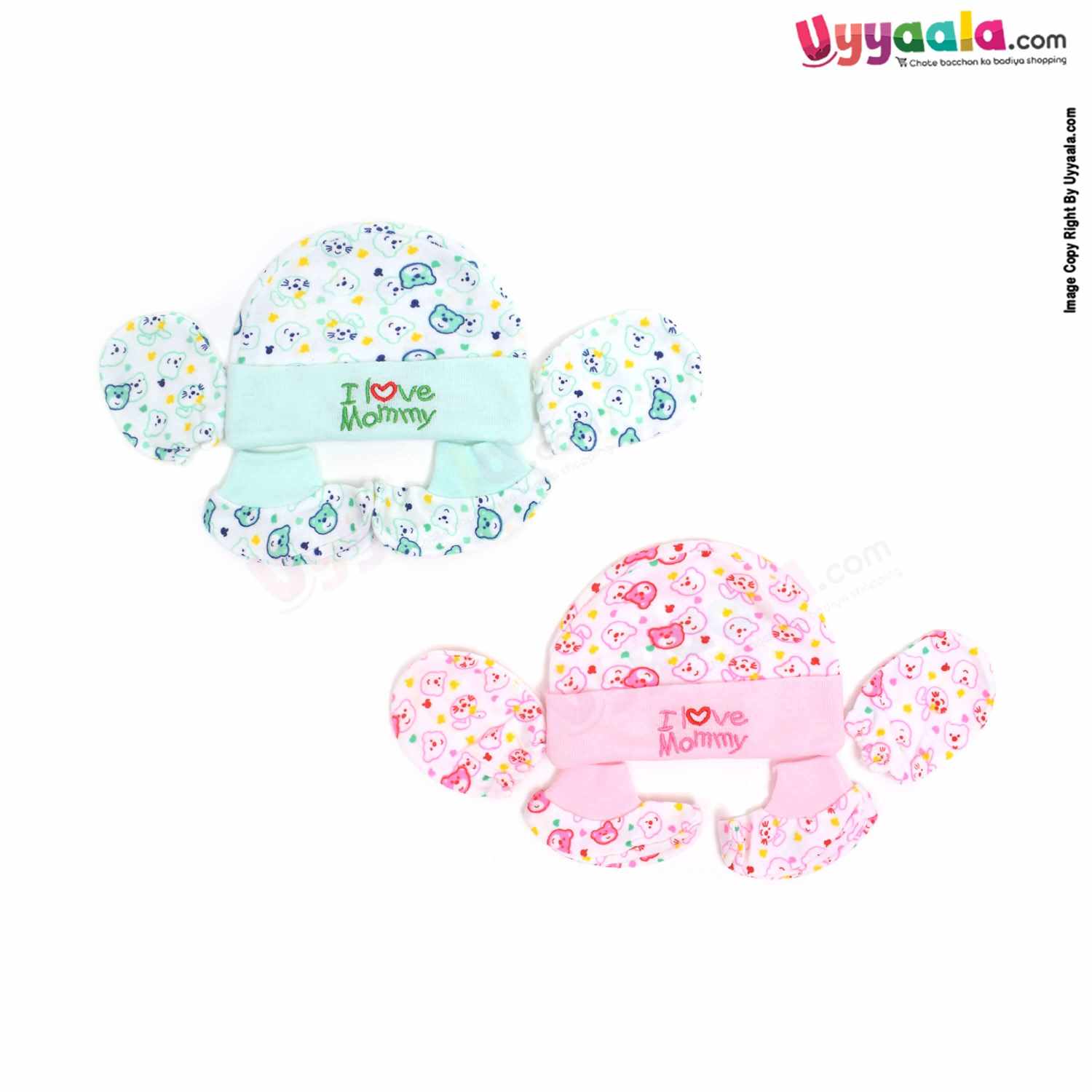 MONTALY Premium Quality Soft Hosiery Cotton Mitten, Booty & Cap Set for Babies with Bear Print Pack of 2 ,0-3m Age- Green & Pink