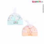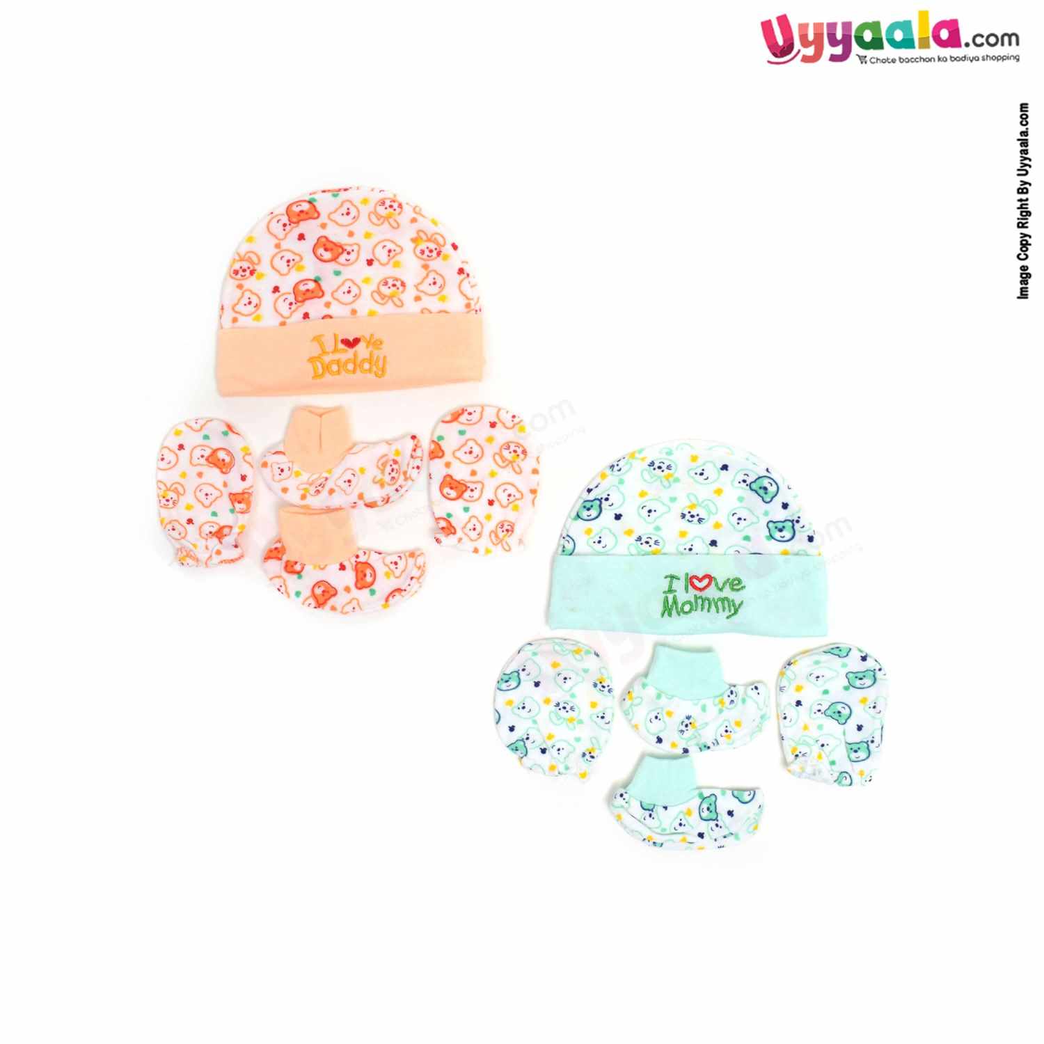 MONTALY Premium Quality Soft Hosiery Cotton Mitten, Booty & Cap Set for Babies with Bear Print Pack of 2 ,0-3m Age- Orange & Green
