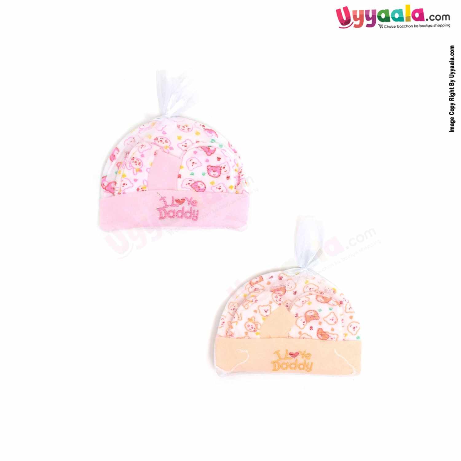 MONTALY Premium Quality Soft Hosiery Cotton Mitten, Booty & Cap Set for Babies with Bear Print Pack of 2 ,0-3m Age- Orange & Pink