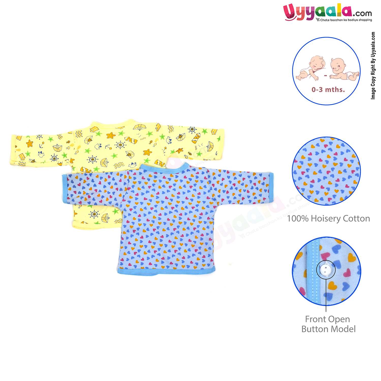 Mothers choice full sleeves front open jablas, 100% hosiery cotton, pack of 2 (0-3M) – yellow & blue with assorted print