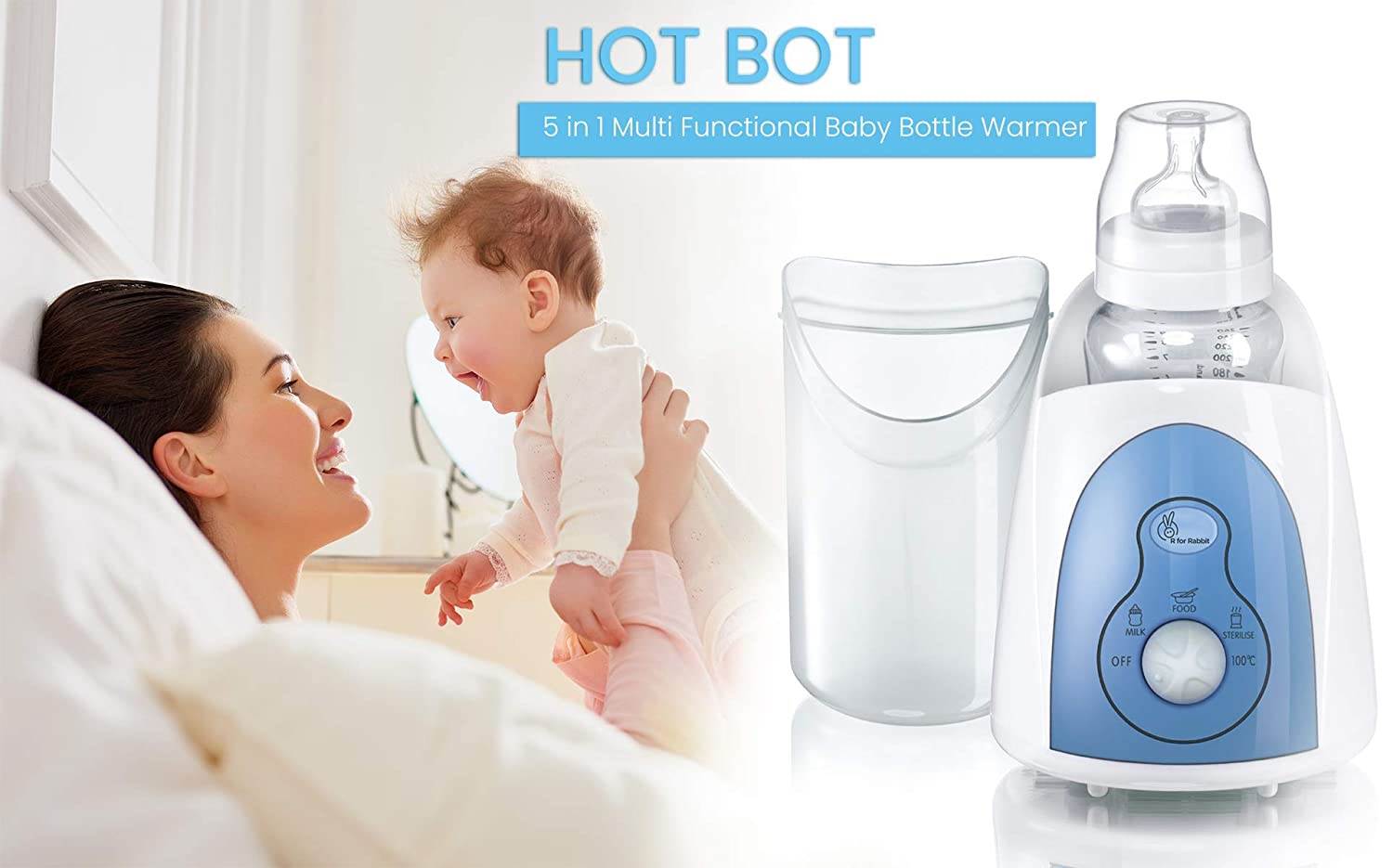 Feeding baby with bottle is a big task which involves warming of milk at right temperature & sterilizing and so R for Rabbit Brings to you Hot Bot 5 in 1 Multi-function Baby Bottle warmer. Hot Bot Bottle Warmer is an easy way to warm the milk for baby in bottle and it’s not just a milk warmer but performs other functions like warming baby food, sterilizing bottle, Juicer, Egg Steamer. Hot Bot is 100% BPA Free and is embedded with best of technology to make your parenting time easy and fun.