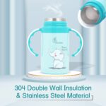 These sipper bottles are made with stainless steel, pp and food grade silicone to ensure complete safety and hygiene for your baby. Its cap assures protection and its leak free design helps you to have hassle-free sipping time. You can also maintain the temperature of liquids inside this bottle for a longer duration due to its double-wall insulation. Have a happy sipping experience with R for Rabbit Steebo Elephant stainless steel sipper bottle.