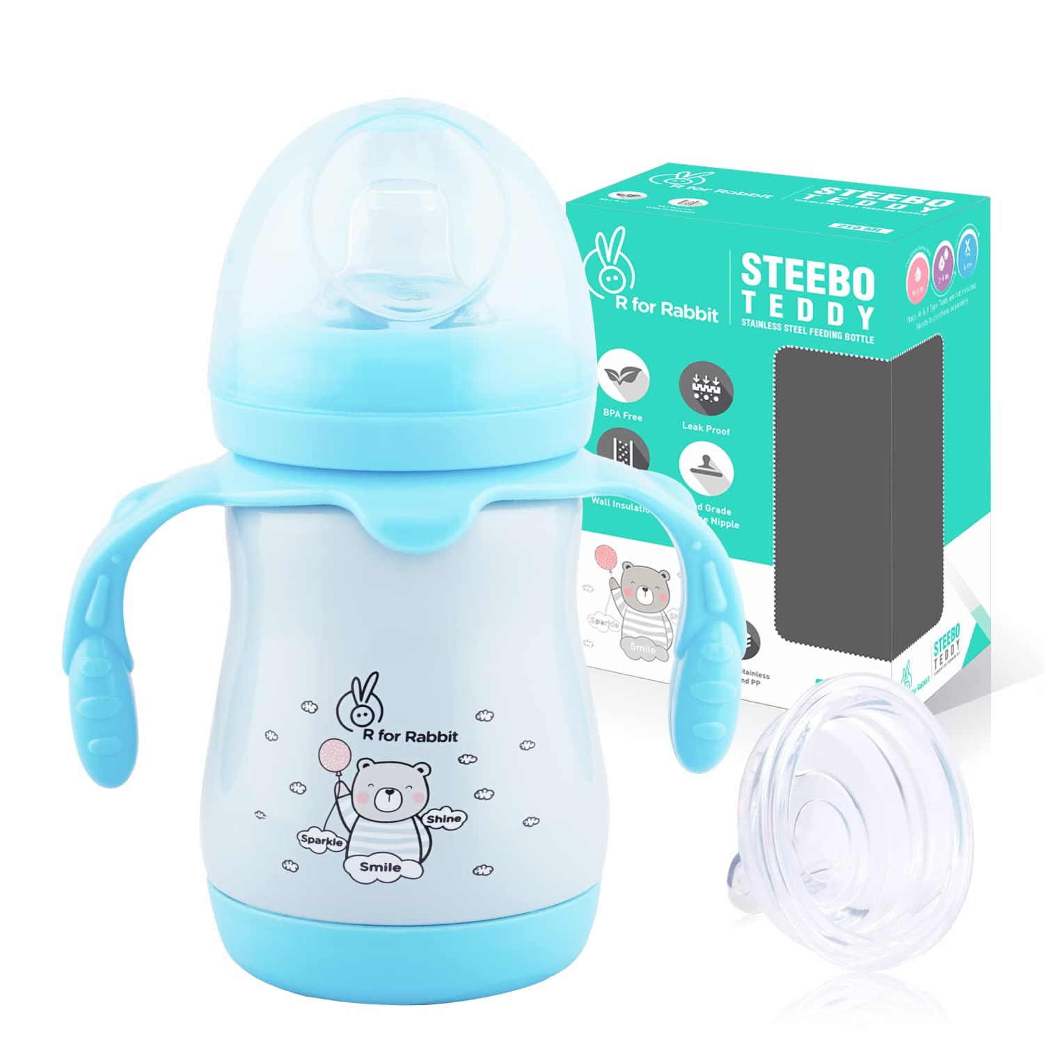 Steebo Teddy stainless steel spout sipper is an elegant looking & adorable baby spout sipper with smooth handles to hold the bottle on its own and enjoy being independent. This spout sipper is made with stainless steel & food-grade silicone material for total safety. Double-wall insulation helps in maintaining the liquid temperature and protects the little hands from getting burnt. So start the journey of liquids for your little one with the Steebo Teddy Stainless Steel spout sipper.