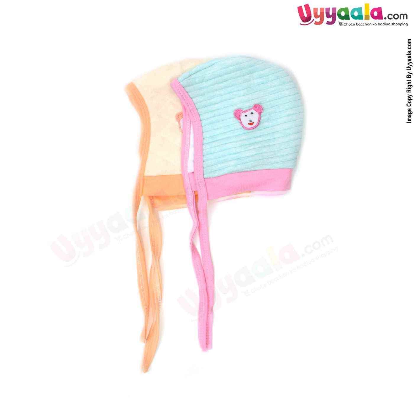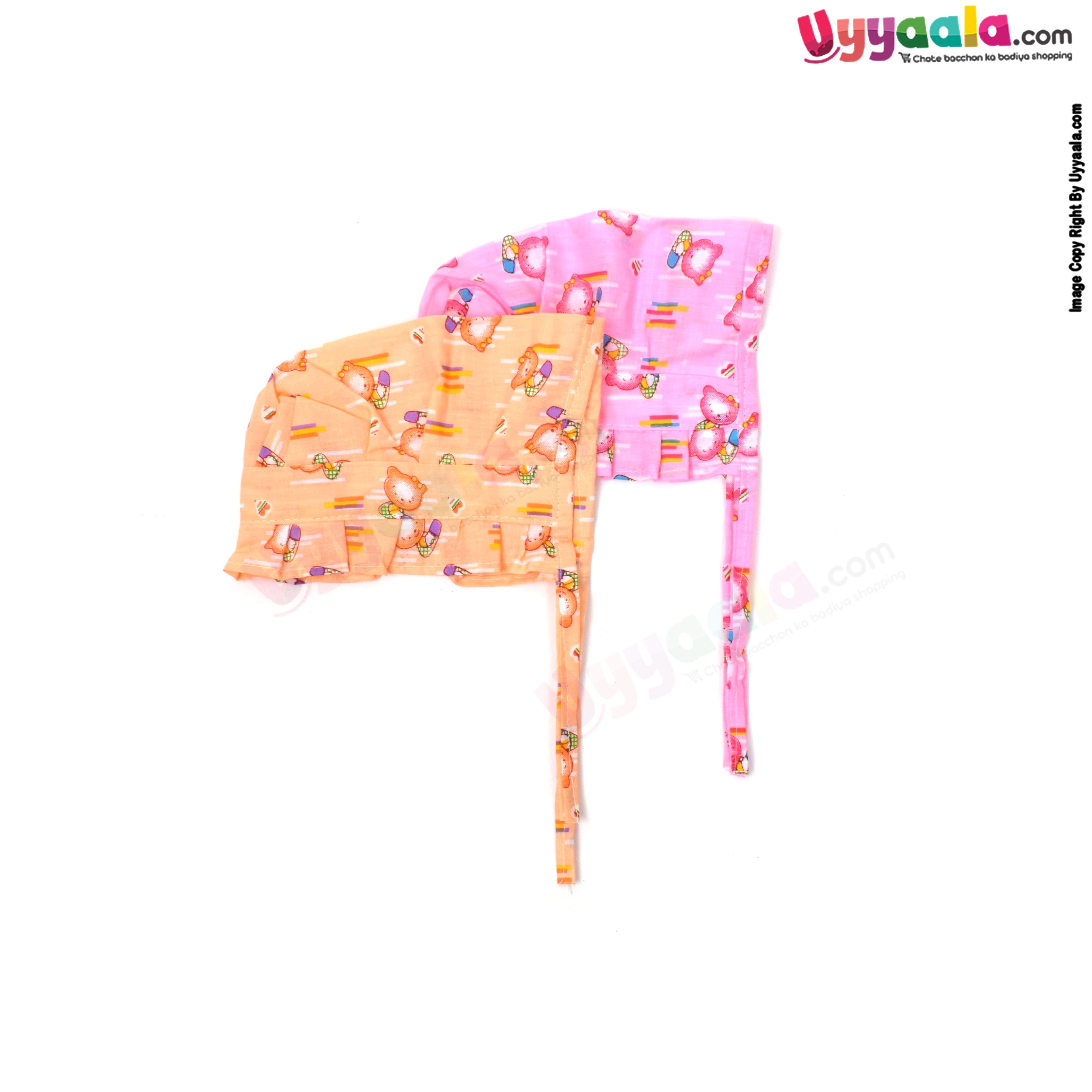 Baby tying cotton caps with teddy bear print (pack of 2) - orange and Pink