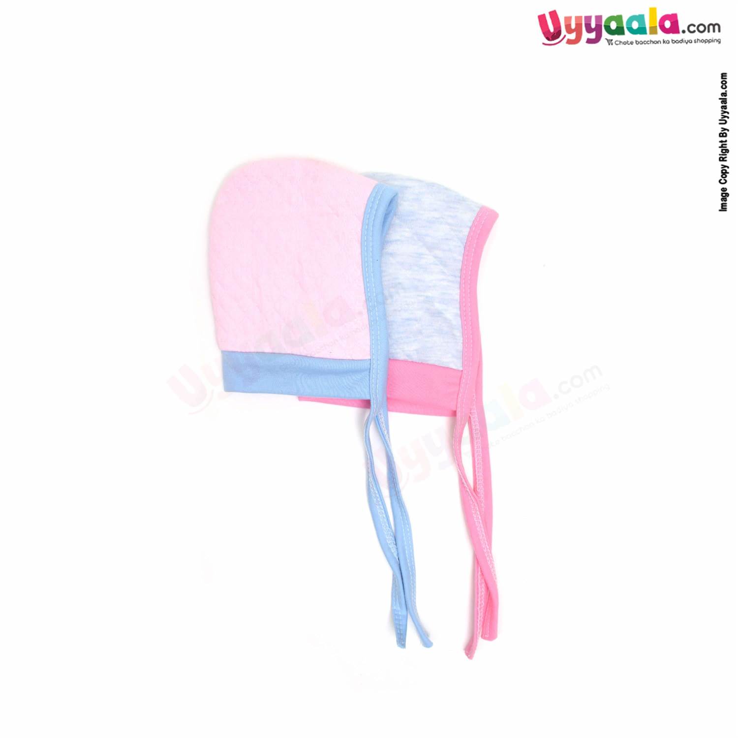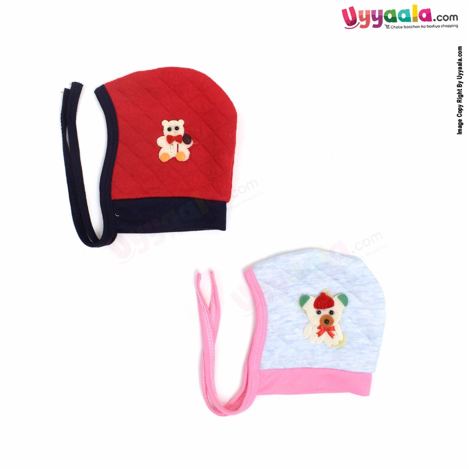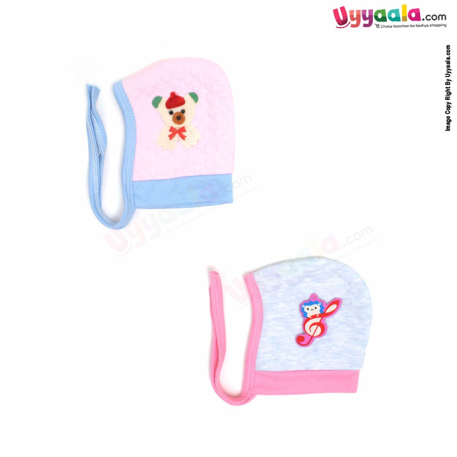 Side Tying Soft Hosiery Cotton Caps for Babies with Teddy Bear & Musical Note Patch Pack of 2, 0-6m age- Pink & Sky Blue