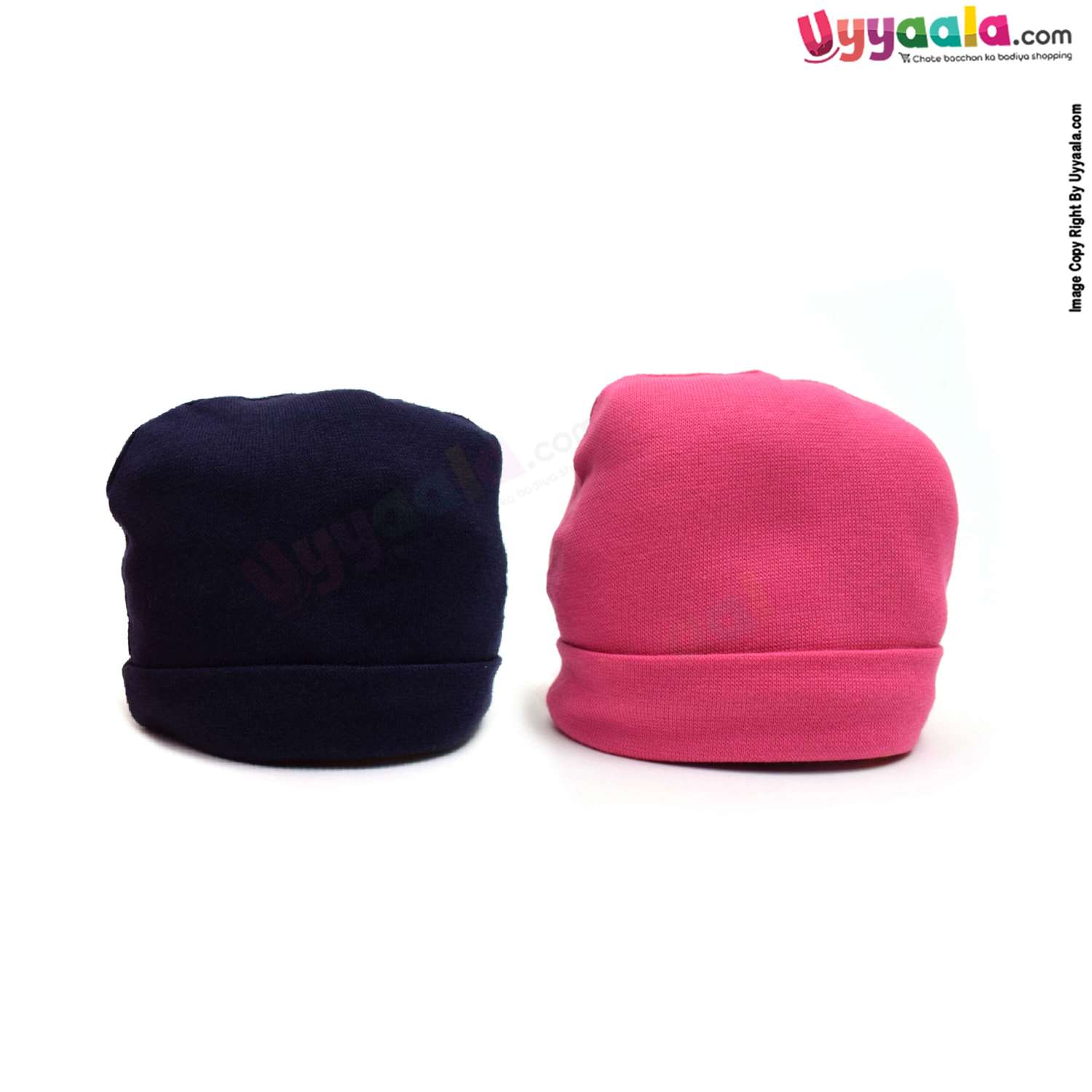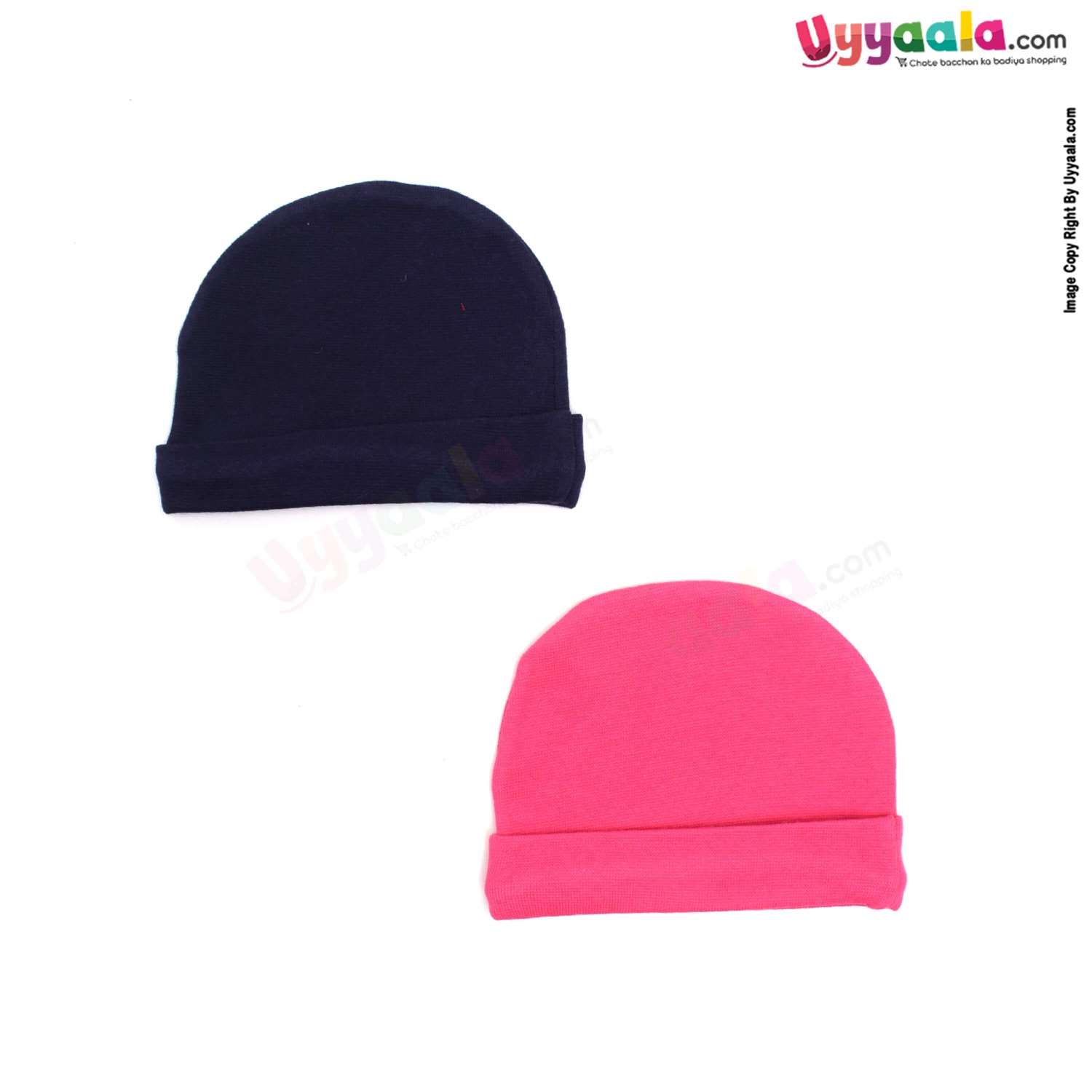 Round Soft Hosiery Cotton Caps for Babies Pack of 2, 0-3 m Age - Pink & Navy Blue